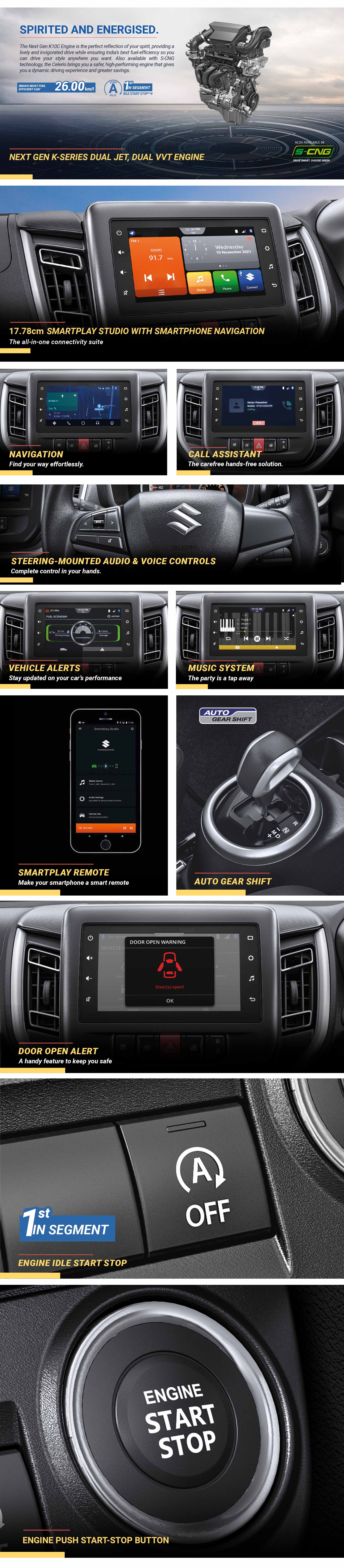 Maruti Suzuki India Limited reserves the right to change, without notice, price, colours, equipment specifications, and models and also to discontinue models and/or replace any part or accessory with any product. Accessory and feature shown in the pictures may not be a part of standard equipment and will differ according to the variant. Image used are for illustration purposes only. ##For details on functioning of safety features, including air bag, kindly refer to the Owner’s Manual. ^The speed alert system gives audible warning for alert of over-speed to driver. When vehicle speed exceeds about 80 km/h, primary level warning with two beeps will sound every minute. When the vehicle speed exceeds about 120 km/h, secondary level warning with continuous beeps will sound. If the vehicle speed is slowed down to about 118 km/h, primary warning will resume. If the vehicle is slowed down to about 78 km/h, speed alert warning will stop. This buzzer does not indicate any malfunction in vehicle.**Spare wheel material is steel (for all variants) and tyre size is 165/70 R14. ***VDA Method. **#Only applicability to Petrol variants. **^Whichever is earlier. ###Available in all the variants except for LXi MT.